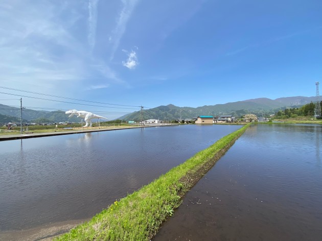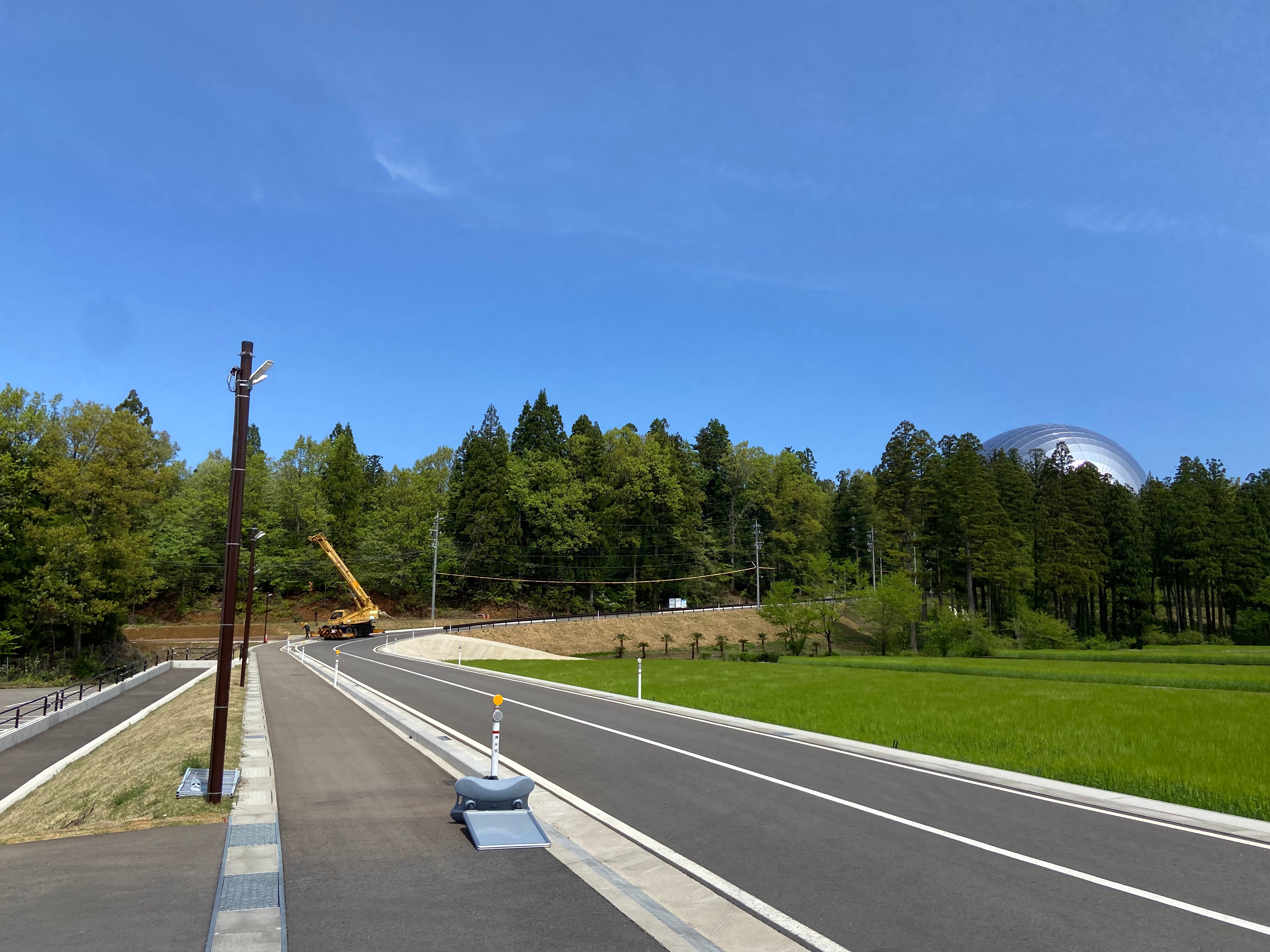 The further out of Katsuyama I get, the flatter everything becomes. I pass rows and rows of rice fields. The flooded type. I’ve always enjoyed the calmness evoked by such a simple sight. Beyond the fields across the horizon, a large silver building sits in the shape of a massive ball. So I head that way. It seems like it might house something historic. About 600 metres out, I can hear something, a thunderous roar. It sounds mechanical, though not entirely.