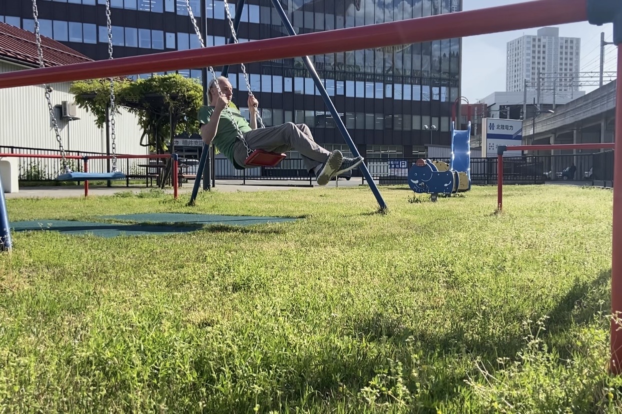 I head back to the station. Here, a single timetable flaps gently in the breeze, listing hourly destinations. Inside, a dragonfly mocks flies fluttering in the artificial air. I have time to kill before my train, so I go and sit in the park, on the swings. I wander just this park before eventually leaving on the train, to Fukui Station. The attendant walks down the train after every stop, before she bows at each person individually; there are twenty-two stops.
