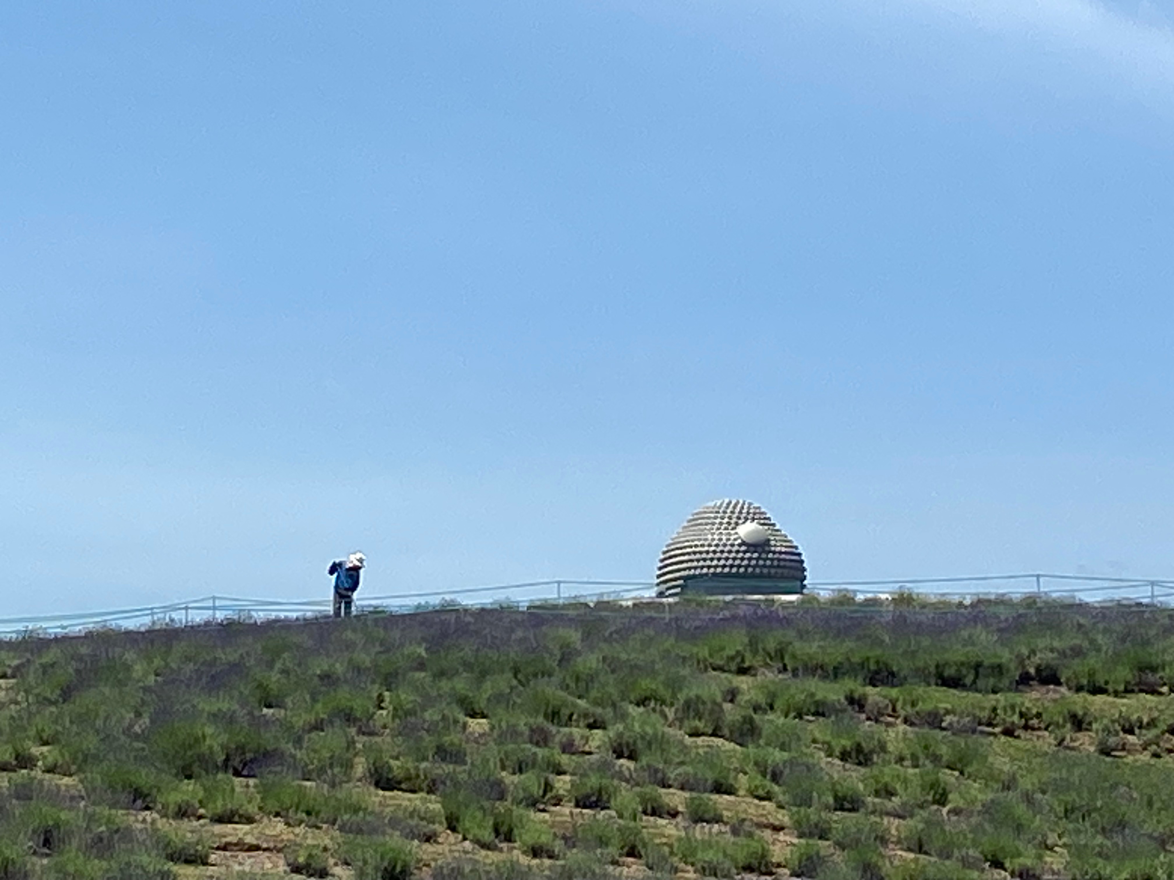 I leave my hotel. The sun is so bright that the sky isn’t blue, but white, yet there are no clouds. It’s like walking through a thick fog of heat. Imagine you’re a little tiny person the size of an ant, walking through an oven set to 180 degrees. That’s what it feels like. I walk across the sheet pan in the direction of the mountains, vaguely knowing that I will arrive somewhere spirally important.